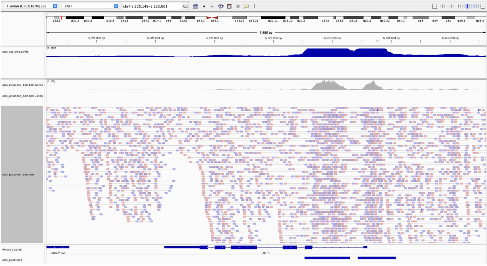 The coverage track can be a source of confusion. The coverage track from the BAM file shows read coverage. However, as we discussed before, the entirety of the fragment is not accessible, only the cut sites. The bigwig file contains a track of the smoothed cut sites and this is what is used to call peaks, not the coverage track.