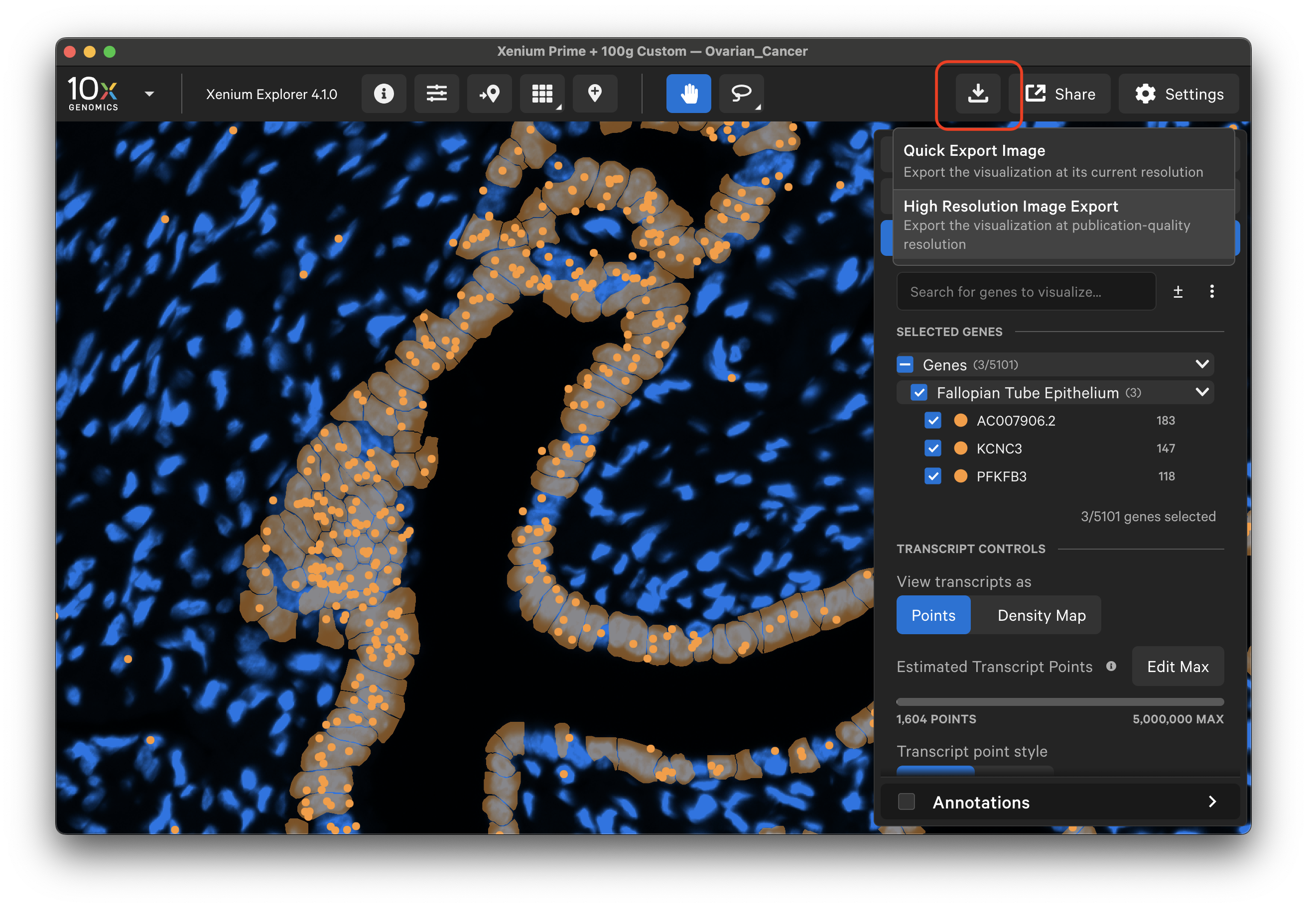 Transcript points can appear smaller in the exported file than in the app viewport, so we recommend increasing the "Transcript point size scale" to ensure points are visible in the exported file. Depending on the region size, exporting may take a few seconds to several minutes.