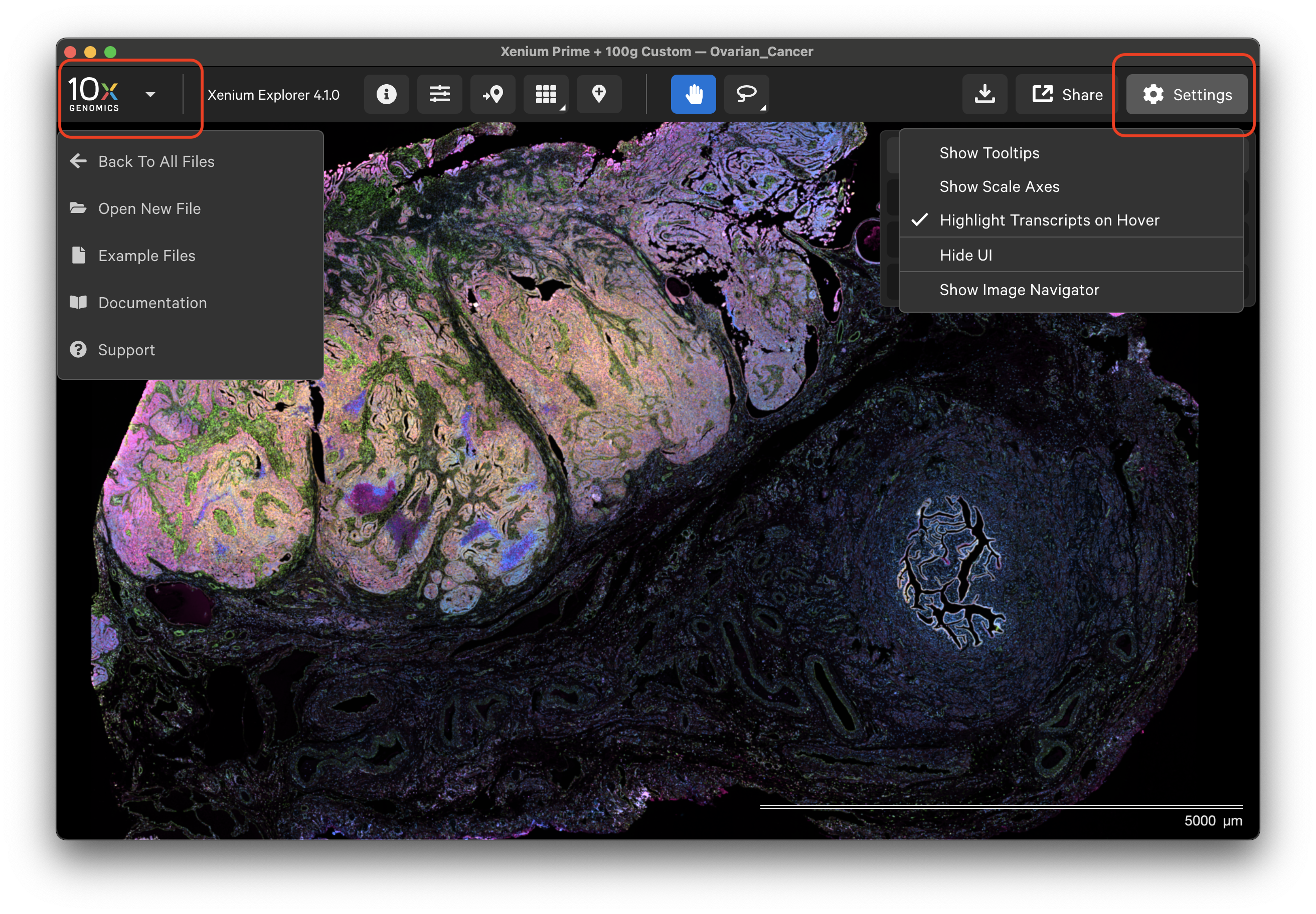 The Xenium Explorer interface settings are controlled in the Settings menu and with keyboard shortcuts. The Settings menu allows you to show or hide transcript and cell tooltips, image scale axes, the user interface (UI) itself, and the image navigator in the bottom left-hand corner.