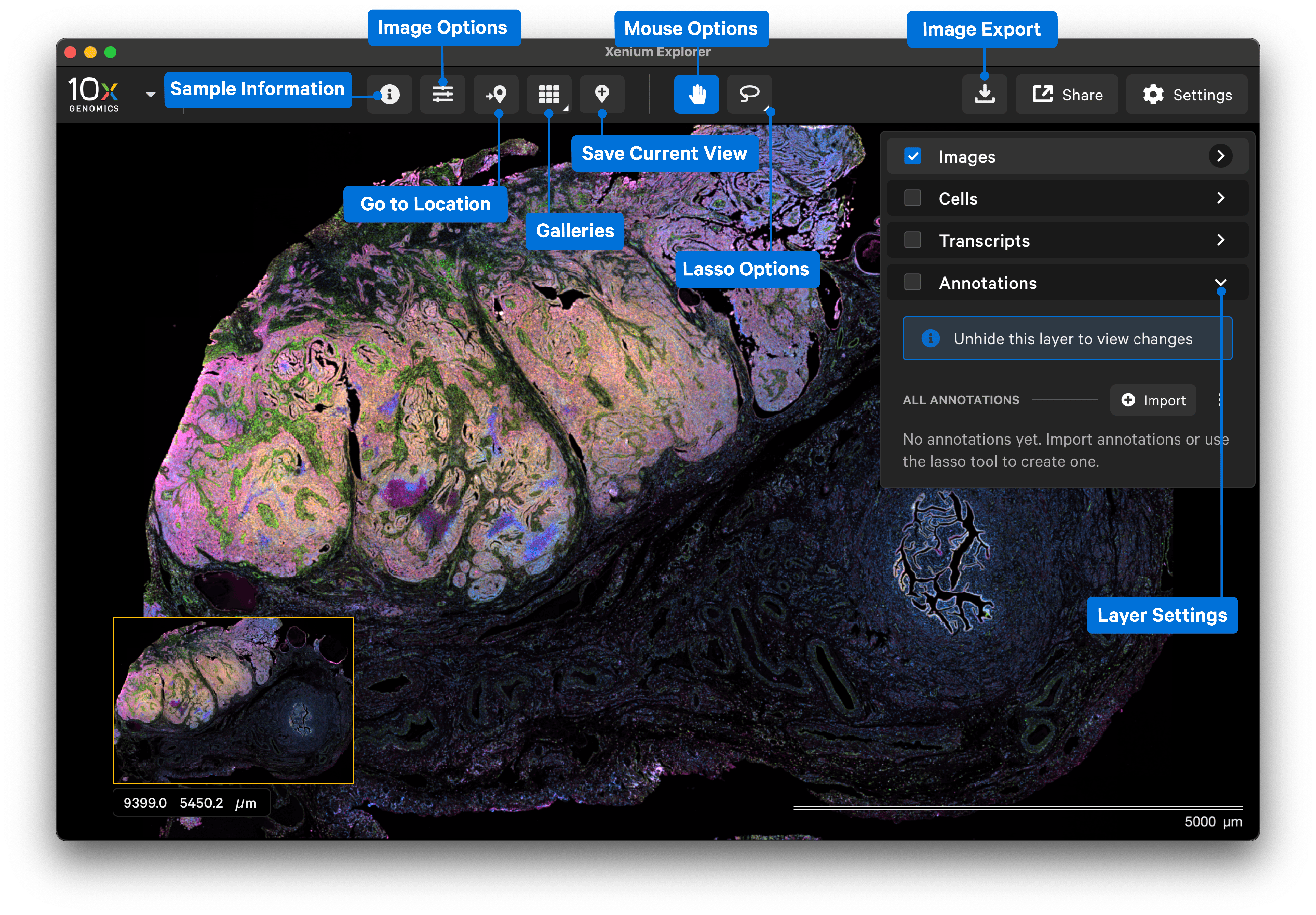 The Images, Cells, Transcripts, and Annotations layers allow you to overlay multiple pieces of information in the explorer viewing area.