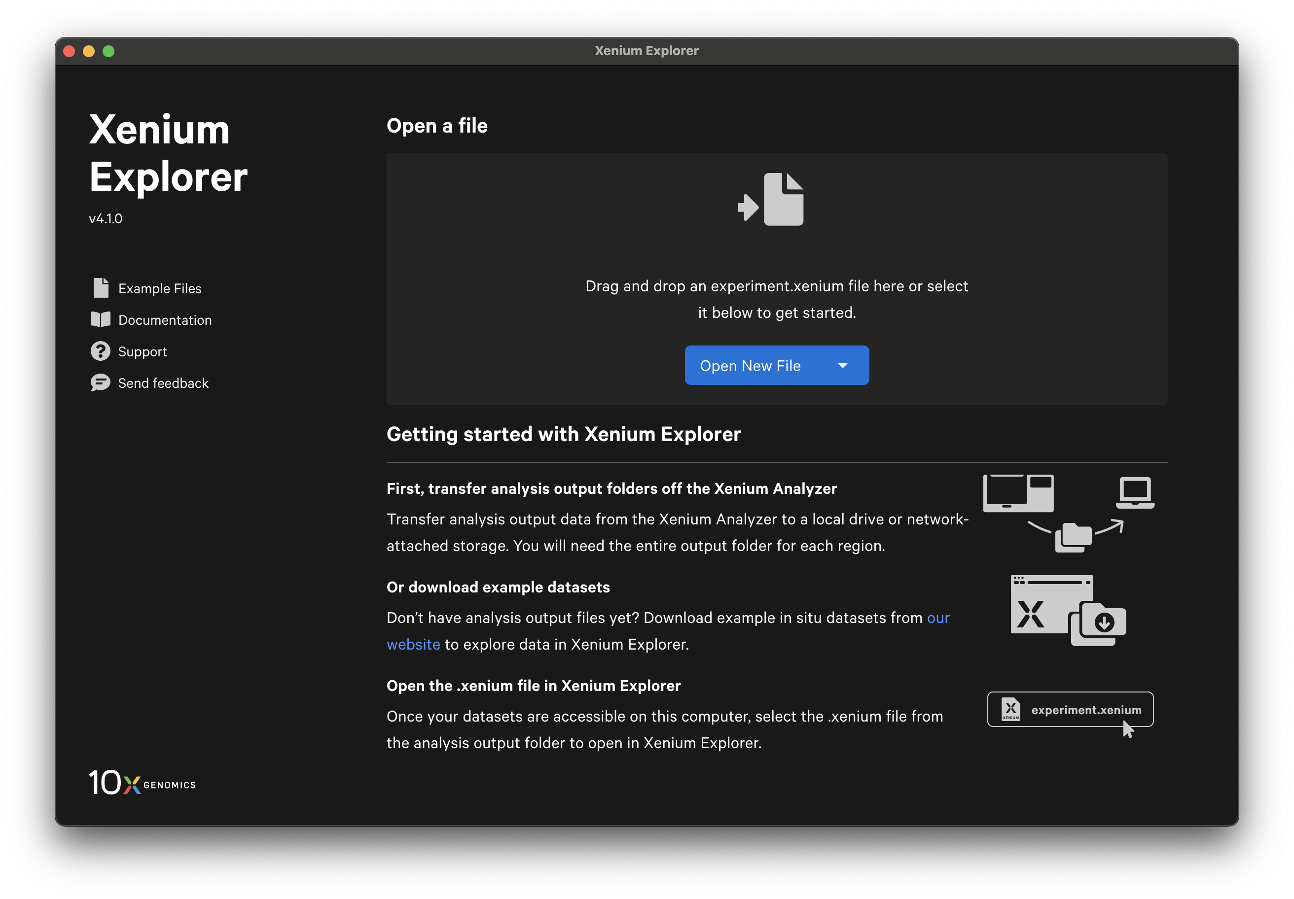 Click the 10x Genomics icon in the top left-hand corner to return to the home screen, open a new dataset, or find support documentation.