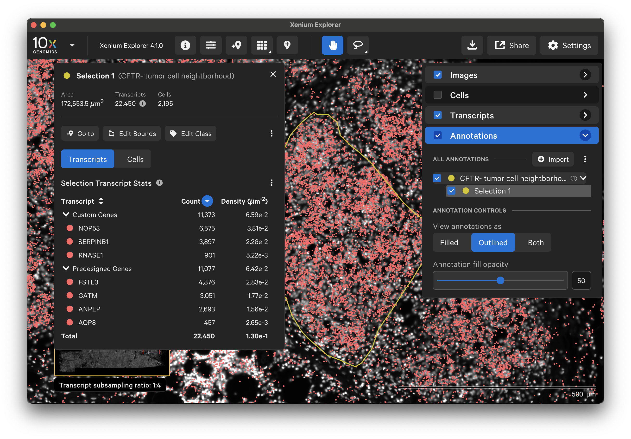 - For cells in selected regions of interest, transcript information is not available.
