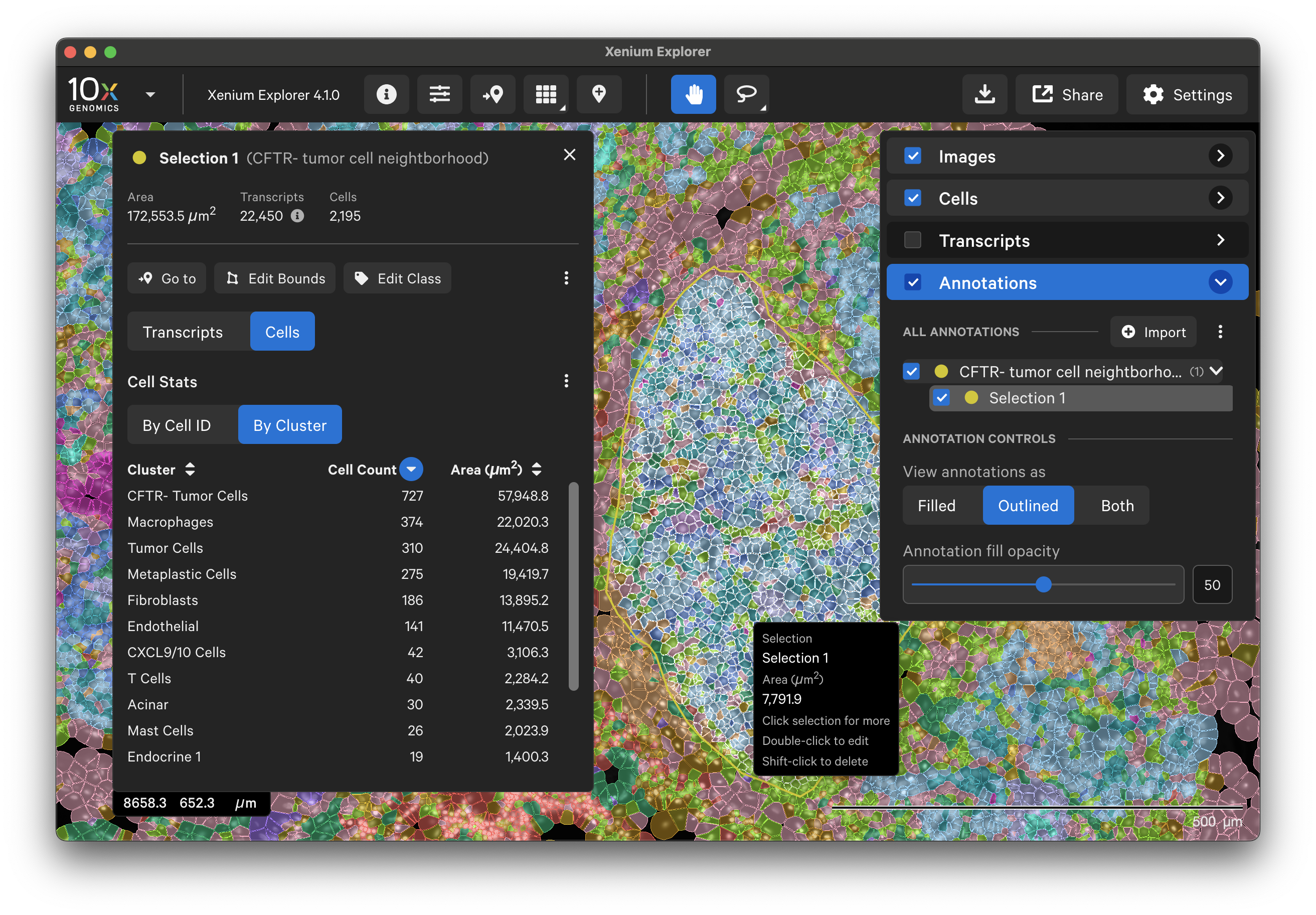 To annotate Regions of Interest (ROIs) in Xenium Explorer, there are two lasso shape options - rectangle and freehand lasso. Here's an example using the freehand lasso tool to count genes per cell a region with CFTR- tumor cells (see pancreatic cancer explorer page):