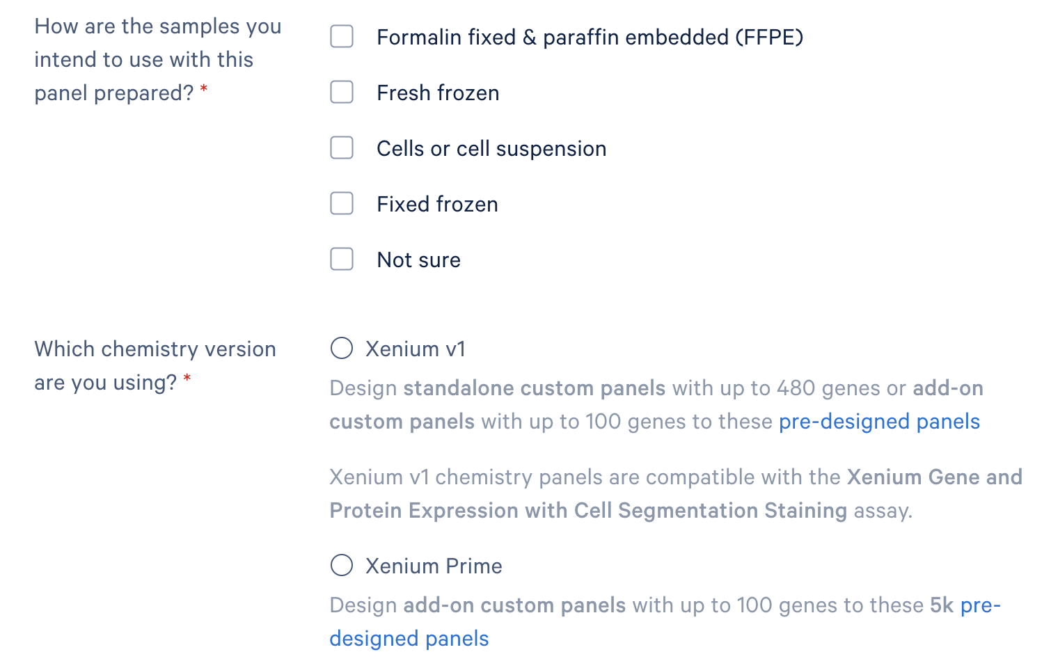 These sections are required for both workflows. The sample preparation method information helps to inform panel design considerations. The Xenium In Situ platform assay chemistry selection determines which custom panel options are available for you to request and informs design considerations.