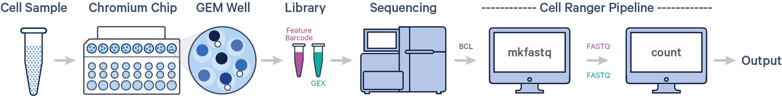 Below is a step-by-step video demonstrating how to create a Cell Ranger analysis on 10x Genomics Cloud Analysis. In this example, one sample was processed in one GEM well and on one flow cell, as illustrated below. After BCL files are converted to FASTQ files (e.g., with Cell Ranger mkfastq or Illumina BCL software), the data can be analyzed with the Cell Ranger count pipeline.