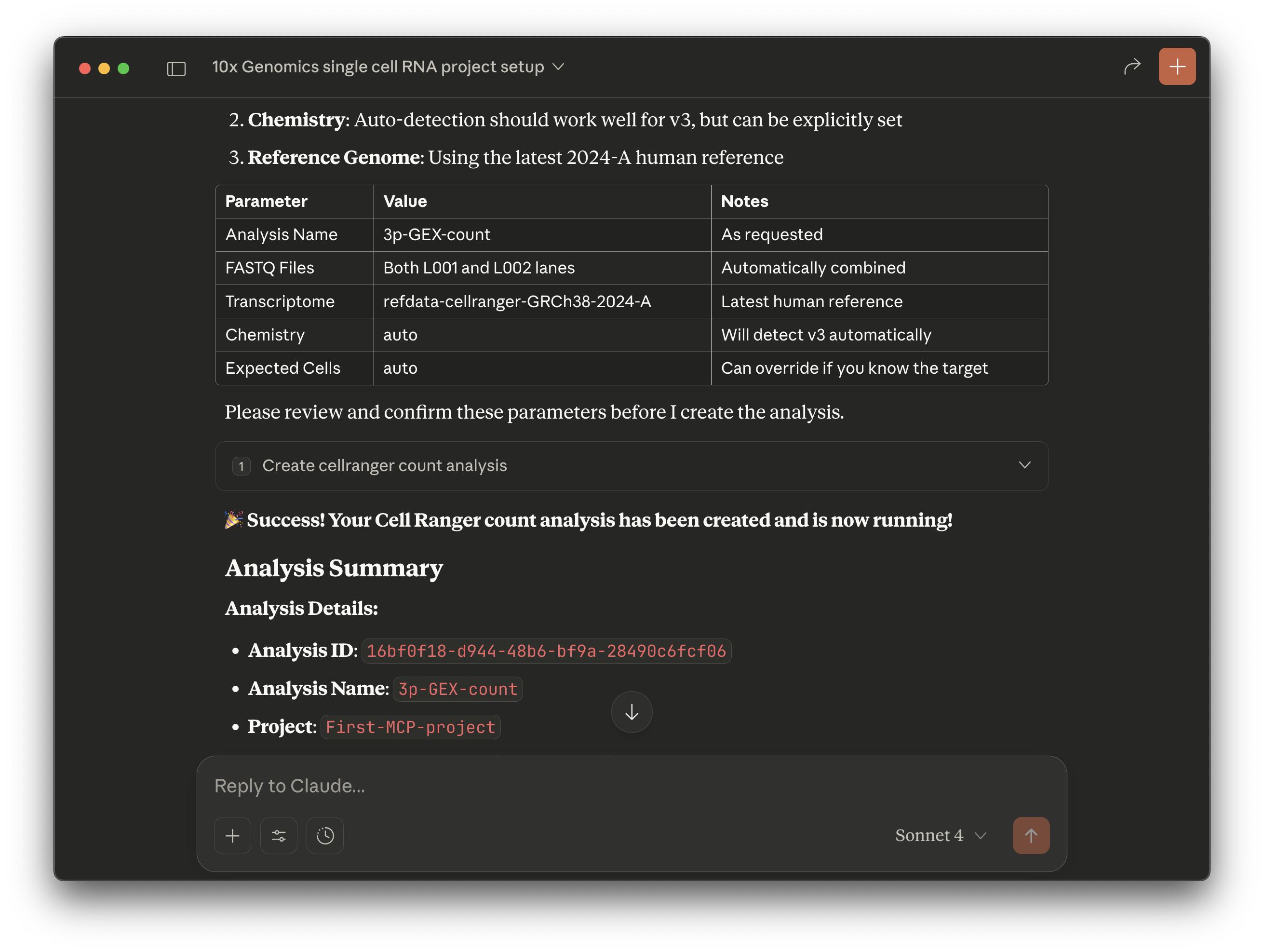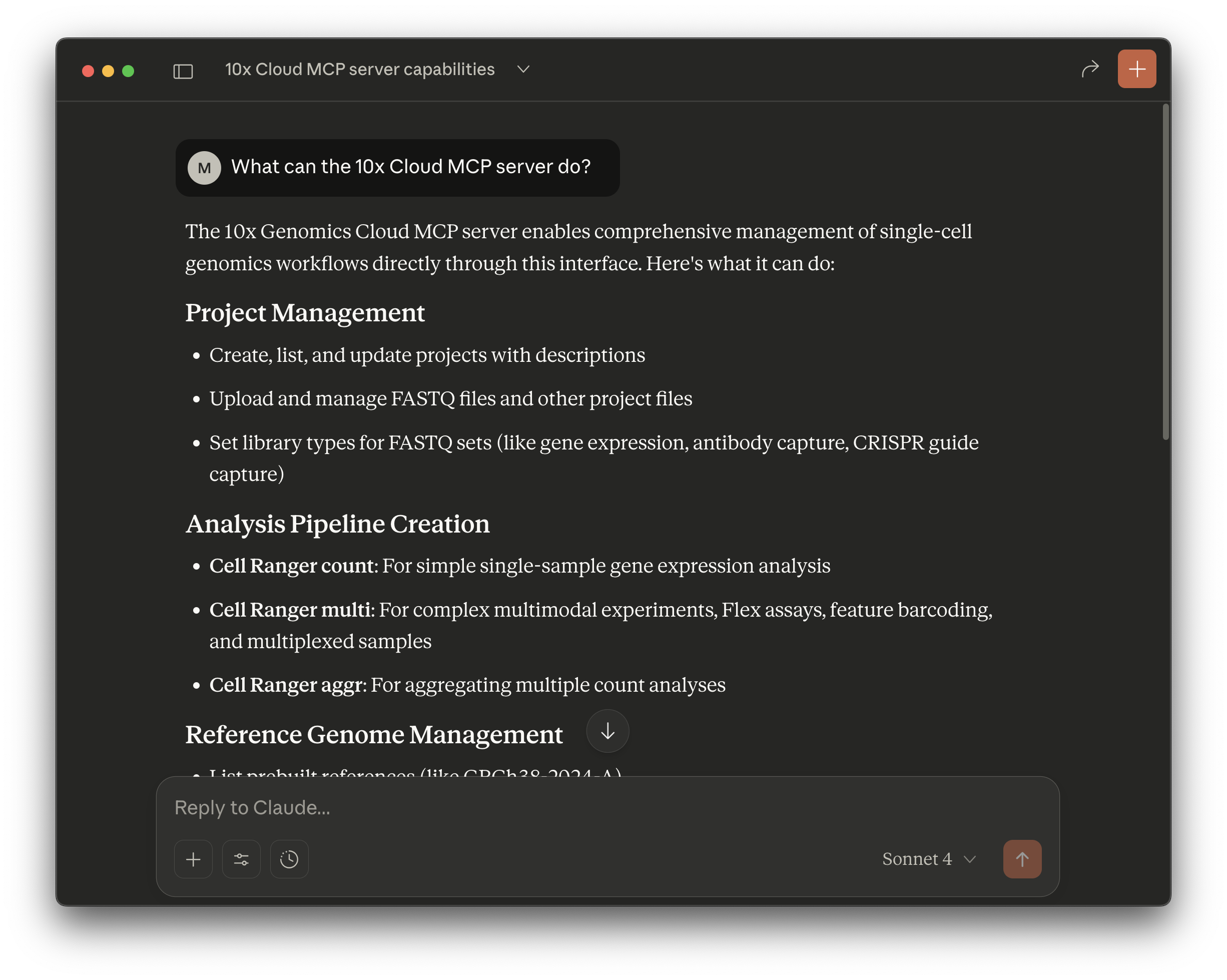 In addition to 10x Genomics' Cloud Analysis web application and command line (CLI) tool, you can analyze your data with conversational prompts in an AI-powered interface. A large language model (LLM) uses the 10x Cloud Model Context Protocol (MCP) server to translate your written requests into actions on the 10x Cloud app. Log in to your 10x Cloud account to verify all the results of the prompt-based interface (e.g., uploading input files, creating analyses).