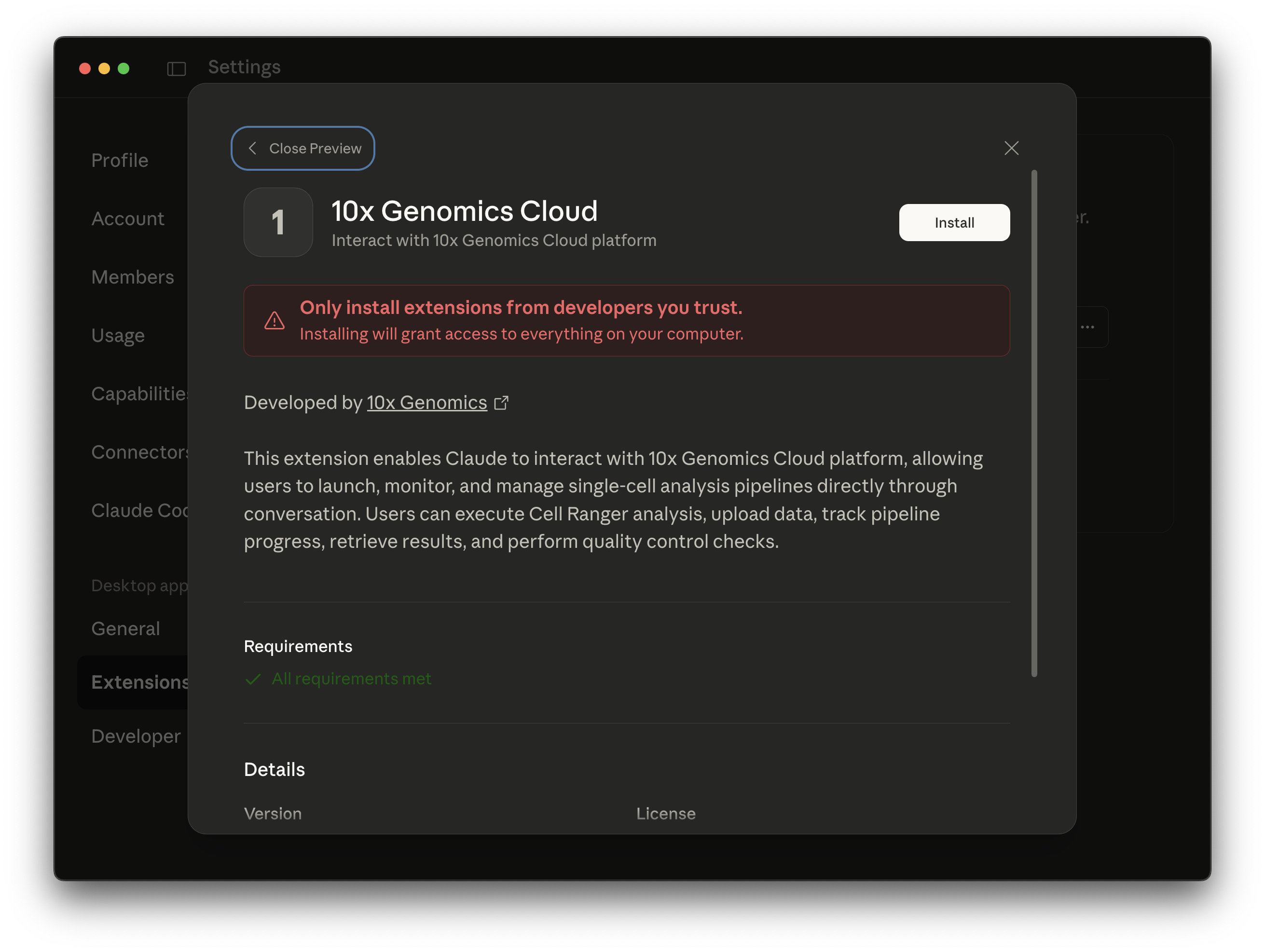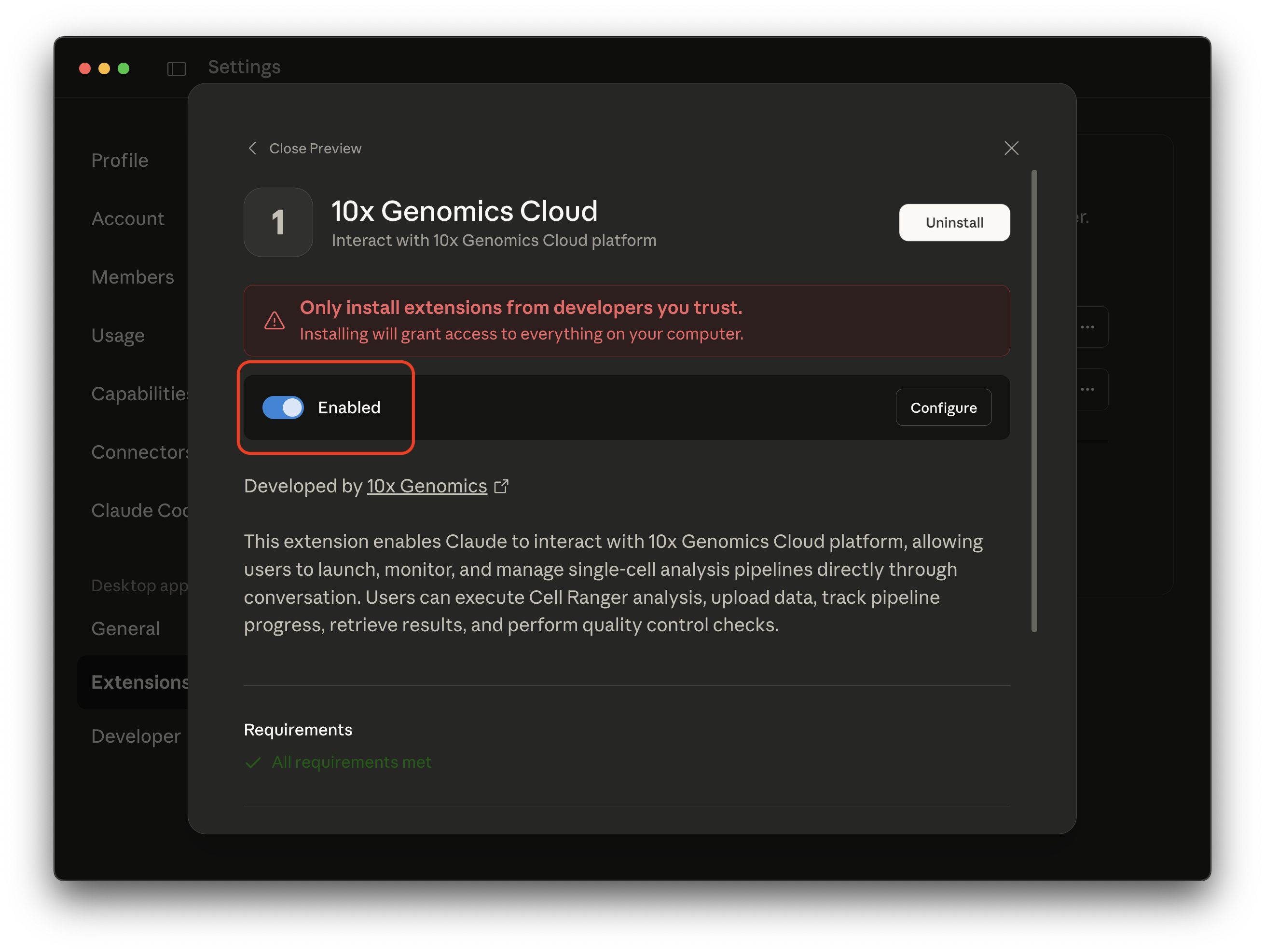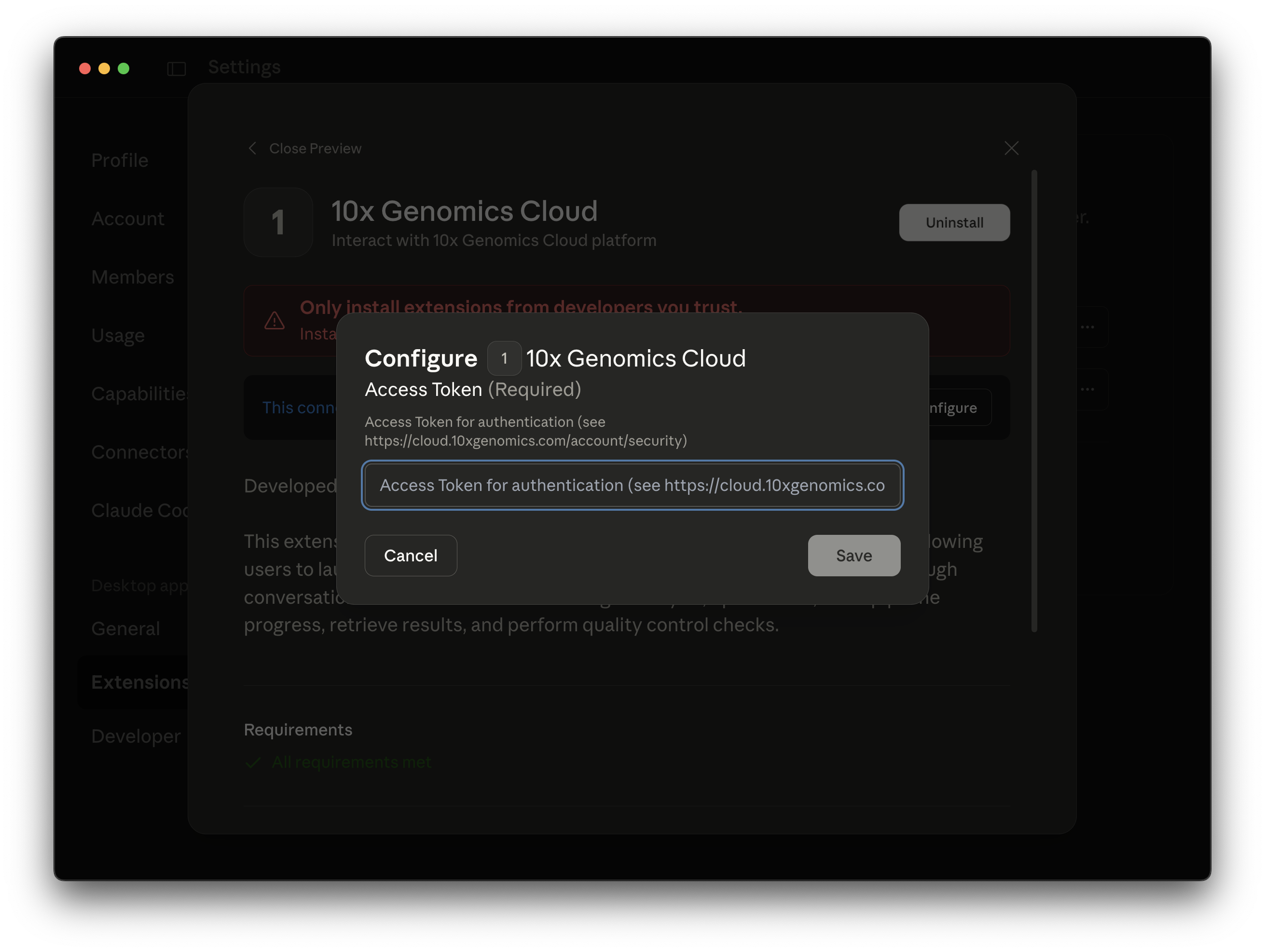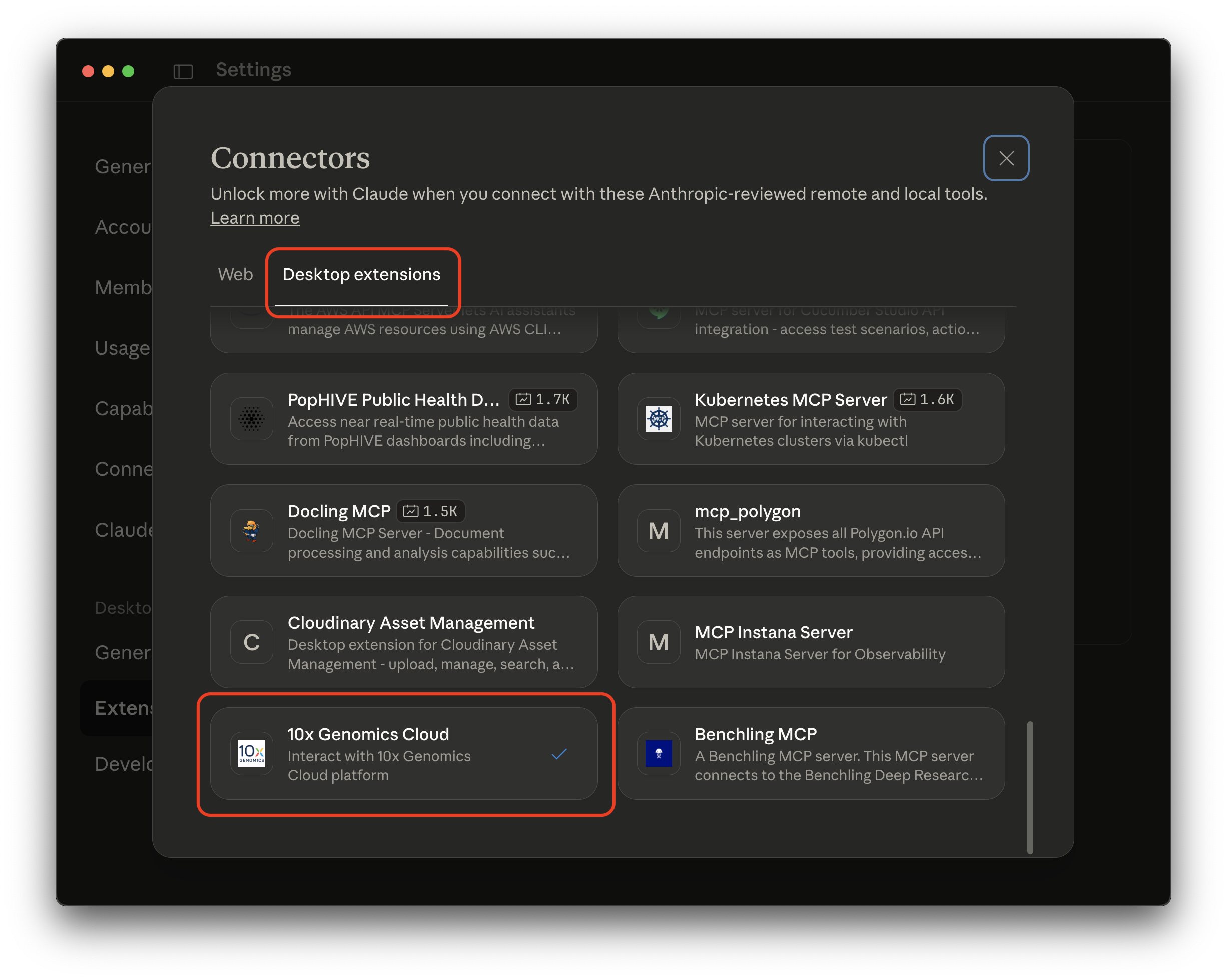 - Option 1: In Claude Desktop, go to Settings > Extensions > Browse extensions. Look for the 10x Genomics Cloud MCP extension.